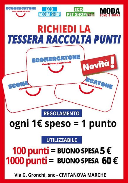 Ora la tua esperienza di shopping diventa ancora più conveniente con la nuova Tessera Raccolta Punti "EcoMarkt": per ogni 1€ speso accumuli 1 punto da trasformare in esclusivi buoni spesa.